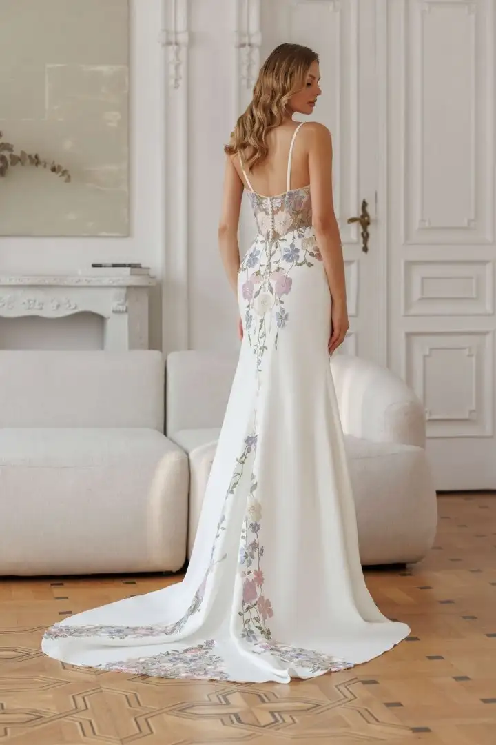De rok, ontworpen in het geliefde mermaid model, vormt zich prachtig rond de heupen en dijen en loopt vanaf de knie vloeiend uit in een elegante sleep. Deze vorm zorgt voor een sierlijke en zelfverzekerde uitstraling, perfect voor bruiden die hun figuur op stijlvolle wijze willen benadrukken. De minimalistische afwerking zonder overdadig kant of glitter maakt deze jurk ideaal voor een stijvolle, moderne of minimalistische bruiloft.